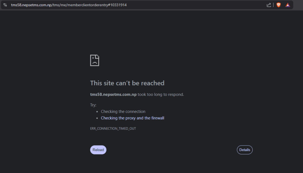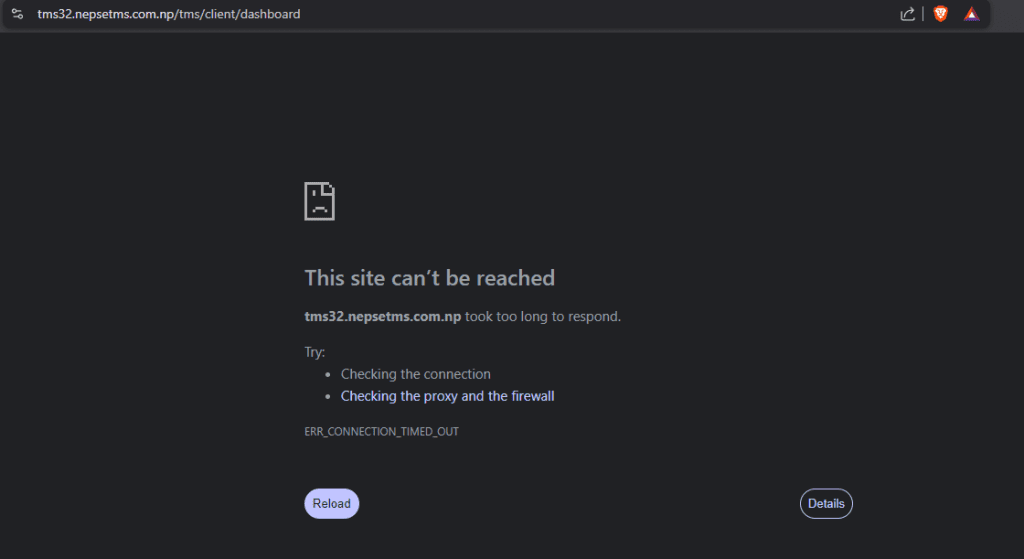नेपाल स्टक एक्सचेञ्ज (NEPSE) अन्तर्गत सञ्चालन भइरहेका विभिन्न ट्रेडिङ्ग म्यानेजमेन्ट सिस्टम (TMS) पोर्टलहरू सोमबार दिउँसोदेखि निरन्तर रुपमा बन्द भएका छन्। प्रयोगकर्ताहरूले TMS-42, TMS-32 र TMS-58 लगायतका प्रणालीमा पहुँच गर्न नसकेको गुनासो गरेका छन्। यी पोर्टलहरूमा लगइन गर्ने प्रयास गर्दा “This site can’t be reached” भन्ने सन्देश देखिने गरेको छ।