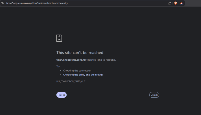 नेपाल स्टक एक्सचेञ्ज (NEPSE) अन्तर्गत सञ्चालन भइरहेका विभिन्न ट्रेडिङ्ग म्यानेजमेन्ट सिस्टम (TMS) पोर्टलहरू सोमबार दिउँसोदेखि निरन्तर रुपमा बन्द भएका छन्। प्रयोगकर्ताहरूले TMS-42, TMS-32 र TMS-58 लगायतका प्रणालीमा पहुँच गर्न नसकेको गुनासो गरेका छन्। यी पोर्टलहरूमा लगइन गर्ने प्रयास गर्दा “This site can’t be reached” भन्ने सन्देश देखिने गरेको छ।