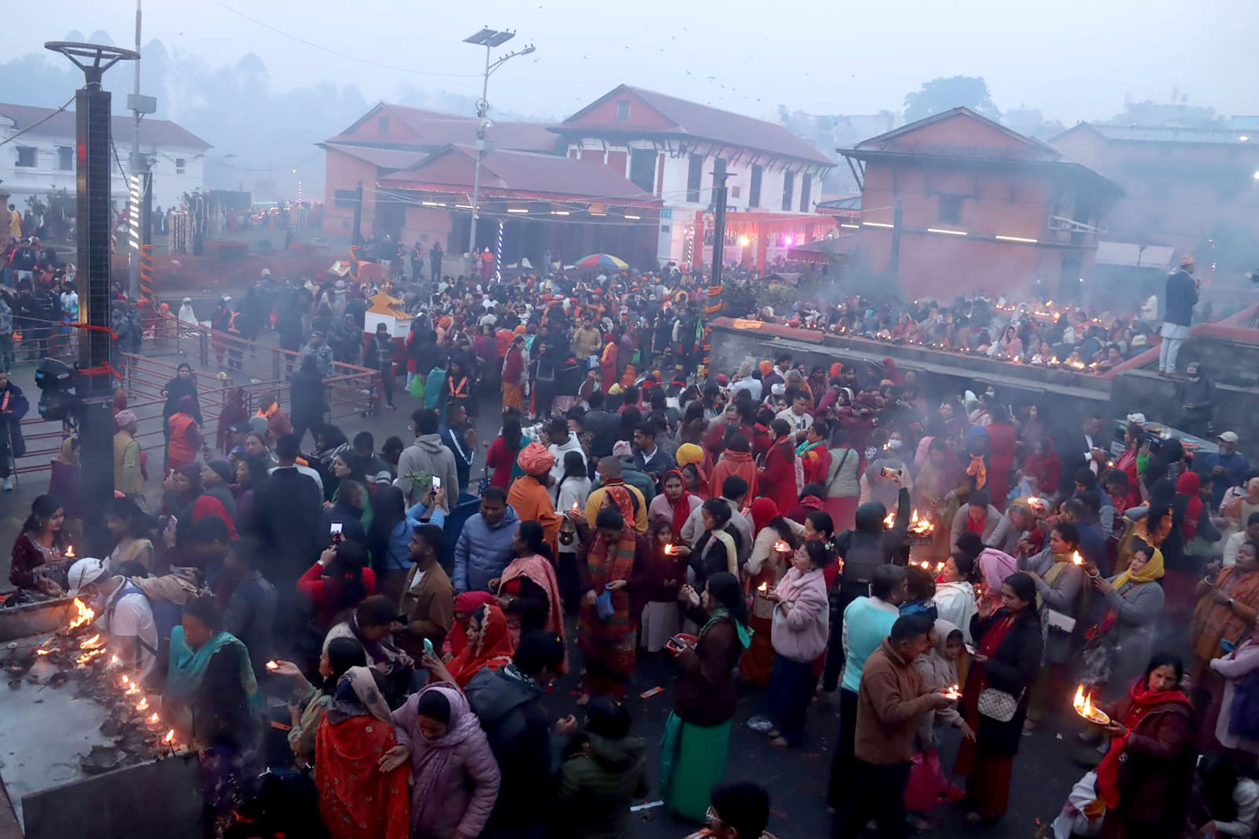 काठमाडौँ, ४ फागुनः जाडो महिना, साँझ परिसकेको छ, चिसो स्याँठले निरन्तर हानिरहेको छ, तर पनि बिजुली बत्तीले झिलिमिली बनेको पशुपति क्षेत्रमा भक्तजनको भीड घट्नुको सट्टा बढिरह्यो । महाशिवरात्रिका अवसरमा आइतबार बेलुकीको यो दृश्य सोमबार बिहानसम्म कायमै रहेको पशुपति क्षेत्र विकास कोषले जनाएको छ । महाशिवरात्रि भएकाले रातभर मन्दिर बन्द गरिएन । मूल सडकबाट मन्दिर क्षेत्र प्रवेश गर्ने मूलढोका पनि राति बन्द भएन । आइतबार बेलुकी सूर्यास्तपछि सुरु भएको महाशिवरात्रिको चार प्रहरको पूजा आज बिहान ६ बजे अघि सकिएको थियो । महाशिवरात्रिका अवसरमा पशुपतिनाथलगायत देशभरका शिवालयमा शुक्रबारदेखि नै सुरु भएको भक्तजनको चहलपहल आज बिहानसम्म पनि कायम रहेको छ ।